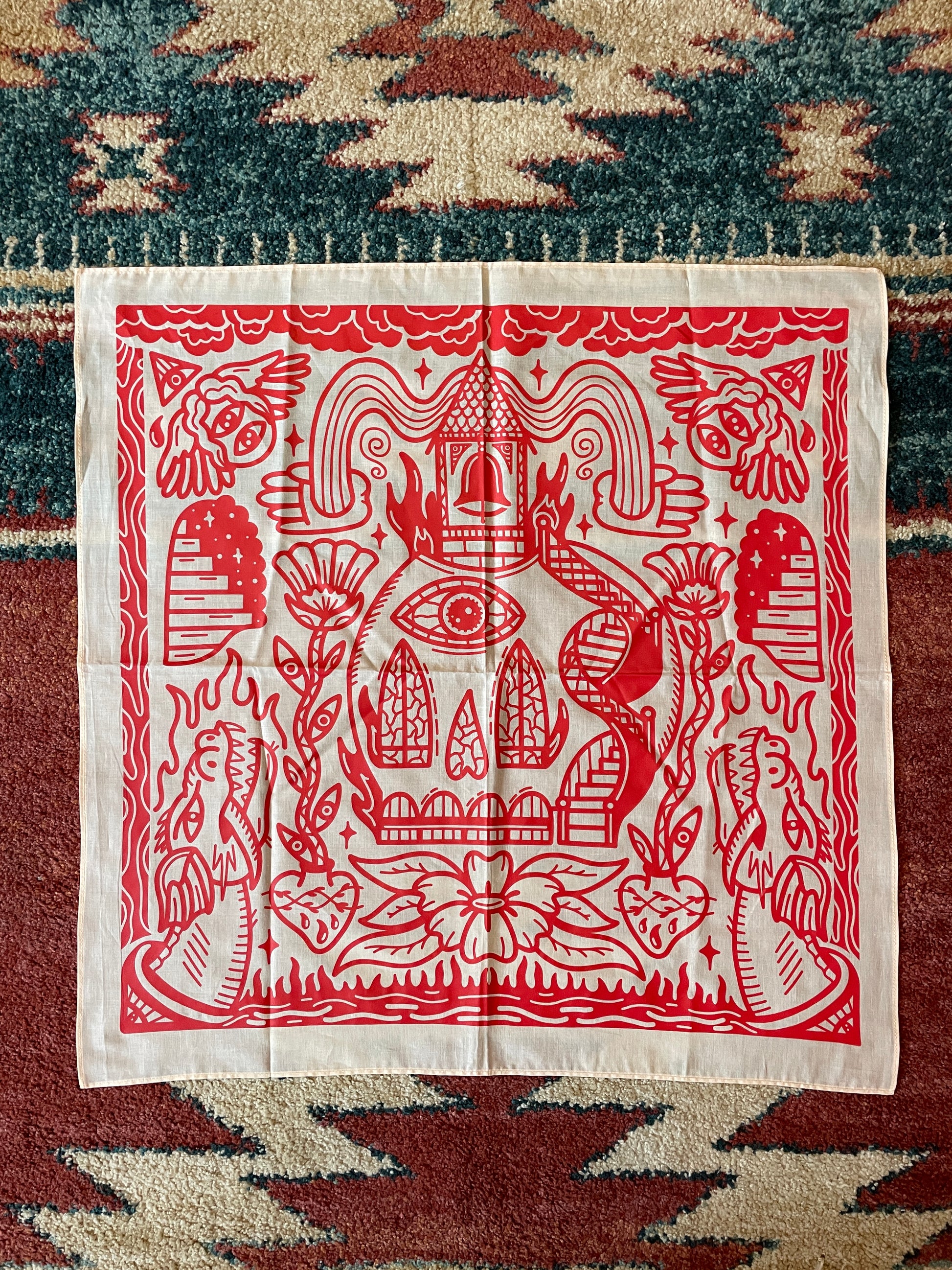 Each bandana is screen printed by hand with red ink on a 21.5" x 21.5" off white bandana; printed by Canopy Press.